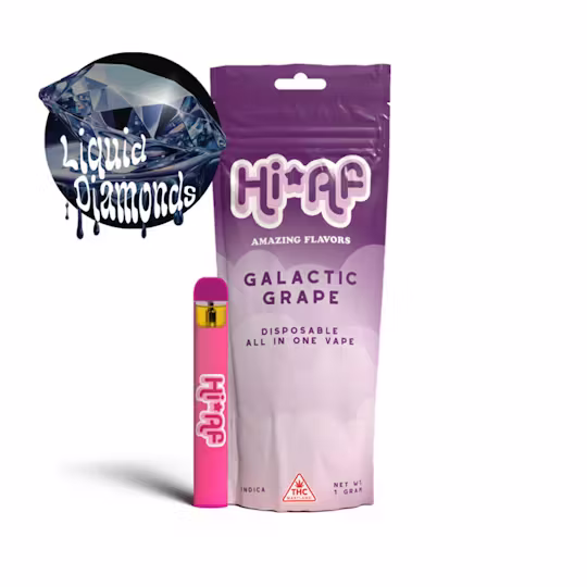 Unwind and relax with the Hi Af Disposable Galactic Grape 1G Liquid Diamond Indica Weed Pen. This premium disposable vape is crafted for cannabis users seeking deep relaxation, flavorful hits, and smooth vapor. Each pen contains 1 gram of liquid diamond concentrate with 88.57% THC. Best of all, it is ready to use straight out of the package.